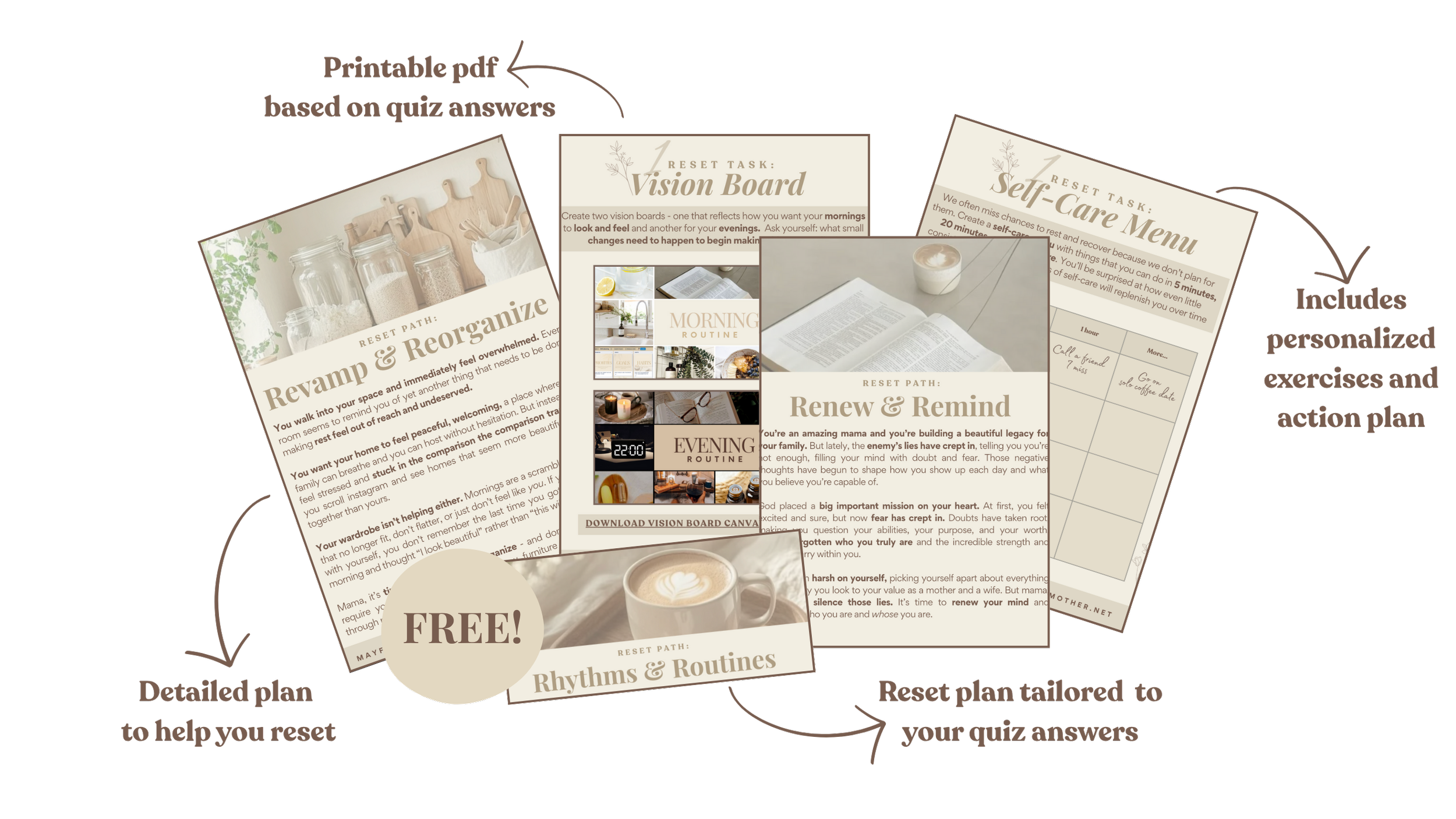 In less than 2 minutes, you’ll discover your mama reset path and receive a personalized plan to help you feel like you again.