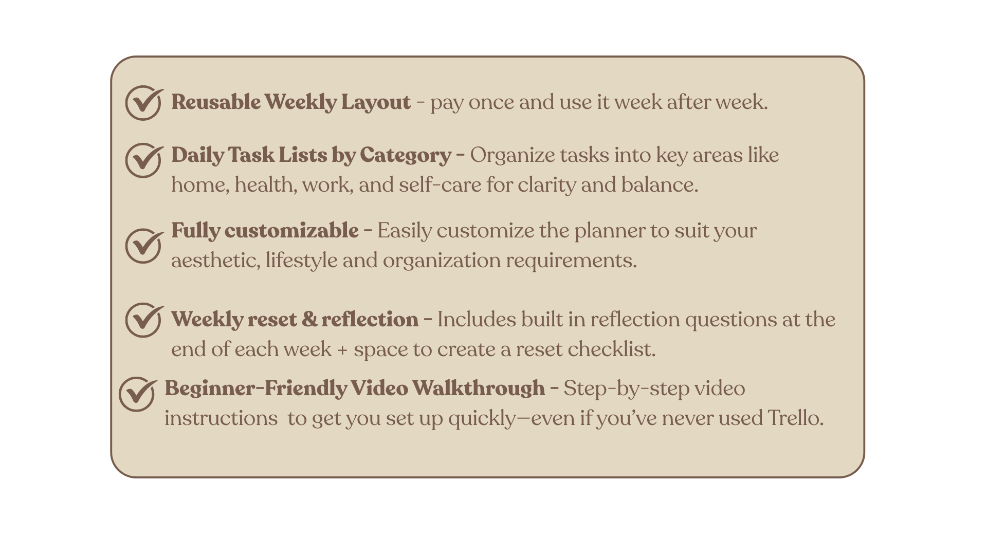 “Beautifully laid out for my weekly planning. I like that the board utilizes all aspects of life and is much more than a "To Do List." The template comes with clear and concise instructions, including a "How To Use" video and a link to the Canva cards used, making everything customizable. I am so glad I purchased this!”